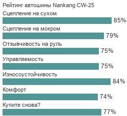 На мокрой дороге… В условиях повышенной влажности под колёсами шину модели Nankang CW-25 очень спасает её активный самоочистительный механизм — устройство в виде ряда расширенных опоясывающих канальцев большой глубины. Благодаря этим деталям протекторной секции достигается полноценная защита от потери тяги на лужах, шина стаёт лучше управляемой и меньше подвержена непредсказуемым откликам на сильно мокром дорожном покрытии.
