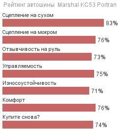 Конструкция и резина В основе шины Marshal KC53 Portran находится укрепленная и стабилизированная конструкция из нескольких слоёв, включая прокладочный слой нейлона для усиления стойкости покрышек к деформации и смягчения внешних ударных воздействий. В жестком каркасе шины также располагаются «глушители» сильных вибраций, что означает мягкость хода при движении по неровным дорожным поверхностям. Резина для этой модели создана на базе новейших ингредиентов, среди которых — активная микро-силика последнего поколения.