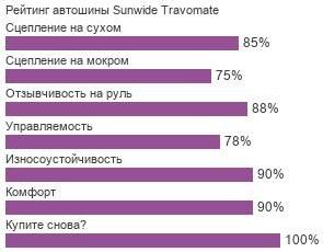 Преимущества применяемых материалов Различные добавки в составе резины способствуют сопротивлению качения, что в свою очередь уменьшает расход топлива. Кроме этого материал отличается термостойкостью и не теряет своих свойств при высоких летних температурах. Приобретая Sunwide Travomate, вы получите достойное качество и доступную стоимость.