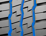 Протектор обладает стойким сцепным воздействием на дорожное полотно благодаря качественно реализованной, сконфигурированной на компьютере системе сайпов с внутренними взаимными блокировщиками.