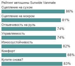 Долговечность шин Sunwide Vanmate Чтобы продлить срок пригодности данной резины для авто, производитель смог использовать силику и специальные присадки. Также смесь для создания данного изделия может «похвастать» инновационными полимерами. Все это в комплексе дает возможность выдерживать повышение температуры до максимальных показателей и улучшает такие эксплуатационные свойства как прочность и износоустойчивость. Поэтому Sunwide Vanmate служат на 12% больше, а расход топлива при их использовании снижается на 15%.