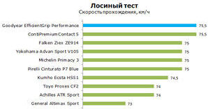 По нижеследующим графикам хорошо видно, что шина имеет низкий тормозной путь и отличается успешным прохождением т.н. «лосиного теста» (это когда автомобиль испытывают на устойчивость при более резких, чем обычно, маневрах).