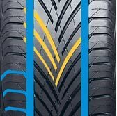 Манёвренность и устойчивость на поворотах достигается посредством мощных жестких зацепов плечевой зоны. Расположенные внутри них прорези дополняют действие продольных широких и глубоких канавок, нацеленных на вытеснение воды из-под колеса. В сочетании с общей направленностью идущих под большим углом ламелей, такая система надёжно защищает авто от скольжения по водяной плёнке и увеличивает проходимость луж в дождливую погоду.