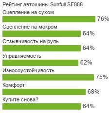 Еще одной необходимой характеристикой является способность резины противостоять истиранию и обладать продолжительным сроком эксплуатации. Компаунд Sunfull SF888 износостойкий и рассчитан на скоростные нагрузки. Кроме этого, он обладает минимальным сопротивлением качению, что в немалой мере способствует экономии топлива. Но, несмотря на жесткость, шинам характерна эластичность, которая обеспечивает мягкий ход и комфорт водителя и пассажиров при движении. Низкий уровень шума, издаваемый покрышками, усиливает положительные впечатления. Шины Санфулл СФ888 — идеальное решение для автовладельцев, предпочитающих скорость.
