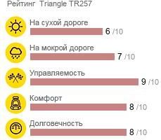Значимым достоинством автомобильных шин Triangle TR257 можно назвать их приемлемую стоимость, которая и обеспечивает высокую востребованность на рынке. Также этот продукт имеет преимущества и в других направлениях:
