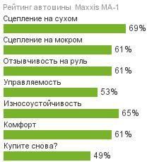 Самоочистка рисунка Для более серьёзных «дождевых» условий вождения предназначены глубинные выемки на рисунке протектора Максис МА-1. Они имеют продольное направление, угловато-зубчатую внутреннюю структуру (образована за счёт внешних граней блоков), и продуктивно выполняют основное предназначение. Благодаря наличию данных дренажных элементов шина Maxxis MA-1 гораздо лучше проходит сильно мокрый асфальт без признаков проявления аквапланирования, обладает усиленным сцеплением и управляемостью в плохую летнюю погоду. По характеристикам сопротивления планированию модель примерно на 3% превосходит ближайшие аналоги.