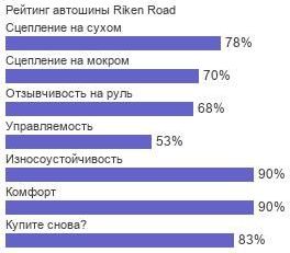 В составе материала летних шин Рикен Роуд видное место занимает кремний мелкодисперсной фракции, что позволяет покрышкам легче катиться по поверхности дорог. Это значит, что у шины Рикен хорошие задатки по части эко-характеристик и водитель может экономить на расходах топлива. Шины-аналоги в тестах