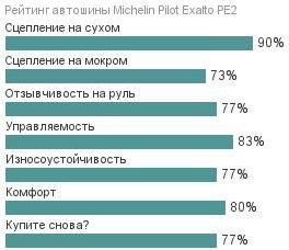 Автомобильные шины Michelin Pilot Exalto PE2 В 2005-ом году компанией Michelin в качестве ответа на растущие требования к покрышкам авто спорт-класса были представлены новые Pilot Exalto PE2 — летние шины со спортивным огоньком для удолетворения нужд водителей, предпочитающих агрессивный стиль езды. Имеющая хорошую славу у покупателей, шина была высоко оценена экспертами. Так, по количеству набранных баллов, в частности по показателям на мокром покрытии и долговечности, Michelin Pilot Exalto PE2 заняла первое место в рейтинге тестов «Авторевю».