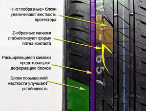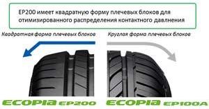 Легковая модель для летнего сезона, которой является, Бриджстоун Экопиа ЕП200 выполнена в ассиметричном ключе. Она имеет специальные «лепестковые» блоки и обратные Z-образные выемки для большего баланса в рассеивании энергии по контактному пятну и усиления жесткости, которое в свою очередь ведёт к лучшему проявлению тягового потенциала.