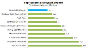 По итогам тестовых программ TÜV SÜD по заказу Michelin в апреле 2015 года в размерности 225/45R17 94Y/W XL и в июле того же года в размере 225/40R18 92Y XL, модель Мишлен Пилот Спорт ПС4 получила первое место в дисциплине управляемости на сухом полотне дороги. Это стало возможным благодаря дополнительному слою на базе арамидно-нейлонового соединения, которое противодействует негативному эффекту центростремительной силы и обеспечивает стабильность пятна касания протектора на высоких скоростях.