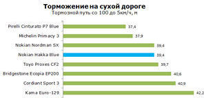 Последние инновации позволяют шине Nokian Hakka Blue демонстрировать тормозной путь почти на 1м короче обычных летних шин (речь идёт о торможении с 80 км/час). Новые ламели Dry Touch эффективно впитывают воду из пятна контакта между шиной и дорожным покрытием, направляя ее затем в главные канавки протектора. Так во время дождя покрышка имеет максимально широкую площадь соприкосновения с дорожной поверхностью, и более прочно держится за ее сухие участки.