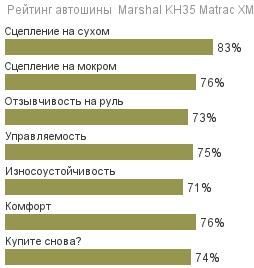 В отдельных дисциплинах шина на 4-6% обходит ближайших соперниц и более старые шины марки Marshal. Стоит отметить, что по сути вся линейка бренда Marshal — это в общем-то успешная реализация технологий шинного концерна Kumho (ему принадлежит дочерняя компания Маршал).