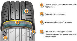 - Улучшает поведение автомобиля на сухих и мокрых полотнах дороги, превосходно справляется с защитой от гидропланирования;