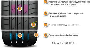 Для шины Marshal MU12 характерна выносливость в борьбе с аквапланированием благодаря полым и широким желобкам, по которым происходит отвод лишней воды из пятна касания. Кроме того модель обладает усилителями прочности, а также ребром жесткости, которое создаёт нужную поддержку, чтобы водитель мог задать более высокоскоростной режим безопасного вождения в сухую или дождливую погоду. В рамках шины Marshal MU12 многое заимствовано из технологий, которые вышестоящая компания использовала в рамках своих гоночных моделей.