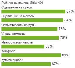 Комфорт езды Чтобы поездка была комфортной, требуется достичь минимального шумового эффекта при езде, а также снизить уровень аквапланирования и повысить противодействие качению. В резине Strial 401 этого удалось достичь благодаря сбалансированности состава материала. Сюда вошли натуральные и синтетические компоненты. Это повлияло на повышение устойчивости к истиранию и механическим повреждениям и дополнительно повысило комфортные ощущения при езде.