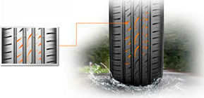 От последствий агрессивных манёвров и скоростного вождения на слякоти защищает стабильно действующая система отвода осадков, которая в срочном режиме осуществляет дренаж пятна контакта автомобильной шины Nexen N-Fera SU4.