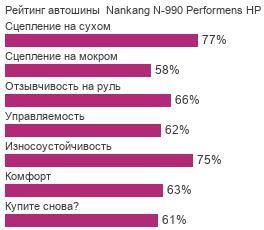 Благодаря ряду стабилизирующих деталей «экстерьера» шины Nankang N-990 Performens HP легко берут не только серпантины с большим количеством поворотов, но и прямые, как шпала, загородные шоссе, где демонстрируют повышенный уровень тяги в сравнении с шинами-аналогами (на 35%). Большая контактная область Шина Нанканг Н-990 Перфоменс ХП снабжена массой острых граней, способствующих сокращению тормозной дистанции при сухой и влажной погоде. Продольные рёбра с острыми кромками позволяют этим покрышкам хорошо противостоять нежелательным явлениям вроде сносов на повышенной скорости.