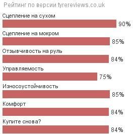 Модель малошумная и стойкая к стиранию. В процентом выражении, говоря о сравнении с ближайшими «родственными» конкурентками по ценовому сегменту, разница между шиной и её аналогами составляет 4-9% по важнейшим показателям.