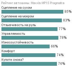 Управляемость Обтекаемые черты профиля и мощные широкие плечи протектора Maxxis MP15 Pragmatra обеспечивают модели превосходную управляемость, быстрый отклик на водительские команды, повороты руля. При помощи плечевых блоков шина достигает мягкость хода и бесшумность, так как многие гасители вибраций находятся именно в этой зоне. Шумность шины понижена по сравнению с прошлым поколением приблизительно на 5%, что было замерено в ходе тестов на испытательных полигонах компании.