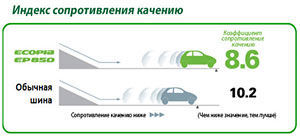 Согласно скромным замерам, по значению индекса сопротивления качению EP850 от Bridgestone превосходит рядовую шину-аналог на 1.6 ИСК (или 4,27%, переводя на показатель экономии топлива). Если сравнивать длину тормозного пути с обычными покрышками того же класса, продукт Bridgestone способен остановить машину на 1.3 метра раньше (улучшение на 4,1%).