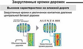 За счёт сегментированности центральных рёбер и разбивке на мелкие блоки, у покрышки Бриджстоун Аленза 001образуются края с округлыми очертаниями профиля, что позволяет привести в норму возникающее давление и снизить риск локального сноса. Также этот момент способствует лучшей курсовой устойчивости.