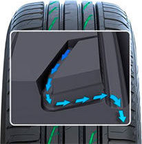 Для сокращения дистанции торможения были использованы ламели Dry Touch 2, которые старательно, мигом отталкивают воду из пространства между покрышкой Nokian Hakka Blue 2 SUV и поверхностью, перенаправляя поток в основные кольцевые канавки. Благодаря расширенному профилю они работают эффективнее, чем стандартные ламели — это особенно будет ощущаться при некоторой стёртости протекторного рисунка.