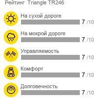 Автомобильные шины Triangle TR246 Автошины Triangle TR246 от китайского производителя имеют симметричное и ненаправленное протекторное строение, дополненное прямыми прорезями, что осуществляют защиту от скольжения и потери устойчивости. Резина каждого блока протектора — это специально созданный более эластичным и гибким к температурным перепадам материал на основе синтетического каучука и кремния, добавок, одновременно сделавших изделие Triangle TR246 всесезонным и менее требовательным к топливу (меньшие затраты энергоресурса).
