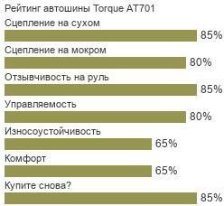 Легкость управления авто Чтобы машина в данной модели шин быстро реагировала на каждую команду водителя, и при этом имела курсовую устойчивость, протектор резины Torque AT701 имеет не только срединное цельное ребро, но и боковые блоковые элементы. Это позволяет машине оставаться более устойчивой в любых условиях. А немного расширенный контакт поверхности резины позволит более автошине плотно прилегать к дороге.