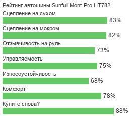 Автомобильные шины Sunfull Mont-Pro HT782 Автомобильные шины Sunfull Mont-Pro HT782 могут стать недорогим средством комплектации Вашего «железного коня», учитывая что для данной модели характерна важная черта — всесезонные возможности, как протекторной дорожки, так и универсального термо-стойкого материала. Ко всему этому необходимо добавить высокий уровень износоустойчивости, комфорта при скоростном вождении, уверенность реакций на скоростные реакции и торможение — впечатляющий букет характеристик для бюджетной авторезины!