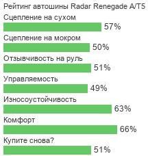 Если одели эту резину, рассчитывайте, что ваше авто пройдет в любой, даже труднодоступной, местности. На шоссе или городском асфальте покрышка Radar Renegade A/T5 порадует неплохим комфортом, устойчивостью к абразивному трению, разумным энергопотреблением.
