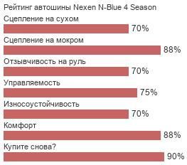 На первое место рейтинга выдвинул в 2018 году данную модель автоклуб ADAC - тест всесезонных шин размера 175/65 r14 (2018) доказал, что автошины Nexen NBlue 4 Season наиболее хорошо адаптированы и надёжно ведут колёса в условиях особо мокрых дорог или заледеневших поверхностей зимней трассы.