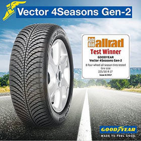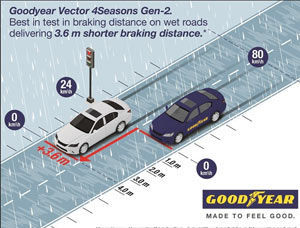 Автомобильные шины Goodyear Vector 4Seasons Gen-2 Модель Goodyear Vector 4Seasons Gen-2 — это снабженная выраженно направленным «аква-дизайном» шина второго поколения популярной модельной линейки Vector 4Seasons.
