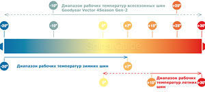 Зимние качества модели во многом задают разбросанные по всей её поверхности угловатые ламели, усиливающие тяговой потенциал, когда это особенно необходимо. Идеально всесезонное использование шин Гудиер Вектор 4Сизонс Ген-2 в климатических зонах, где зимой на дорогах сравнительно мало снега, а температура воздуха не сильно морозная. Рабочий диапазон температур модели весьма широк и составляет от -10 до +25 градусов по Цельсию.