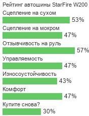 Необходимо заметить, что модели StarFire W200 характерны сразу два дизайна. У размеров со скоростным индексом T рисунок центральных шашек рисунка направлен «ёлочкой». У размерностей на букву H протекторное формирование состоит из разнообразных по внутреннему «узору» блочных линий центра и плеча. Стоит учесть все эти факторы при покупке резины StarFire W200.