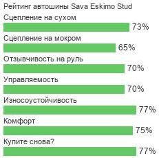 Рейтинги и тесты Экспертный отдел онлайн-издания ABW.BY в тестах 205/55 R16 (2017) отметил, что Сава Эскимо Стад лучше справляется с асфальтовыми дорогами, чем с сугубо зимним покрытием из льда и снега. Шведский журнал Teknikens Värld в программе исследований размера 205/60 R16 (2017) выставил модели Сава 14 место из 18-ти, сославшись на «убедительные зимние характеристики».