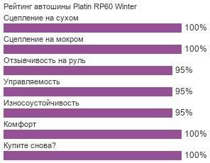 Множество ламелей и активное внедрение трёхмерных насечек позволили создать шину с предельной эффективностью торможения на льду, следовательно автошины Platin RP60 Winter можно рекомендовать тем, кто хотел бы взять на зиму «шиповку», но не хочет впустую расстаться с комфортом, характерным для нешипованных шин.