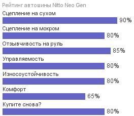 Особенности и преимуществаТак как у шин Нитто Нео Ген максимально летний и «шоссейный» тип протектора, использовать их в бездорожных агрессивных условиях не рекомендуется, ведь это чревато потерей основных преимуществ, которые можно получить, установив на свой легковой автомобиль эту стильную спортивную резину.