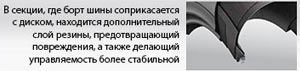 Бортовая зона Часть, где шина крепится к диску, оформлена при помощи защитных барьеров из более толстой резины. Эти слои позволяют конструкции не только лучше прилегать к колесу, но и снижают риск повреждения о различные дорожные препятствия. Бортовые зоны Laufenn X-FIT AT (LC01) за счёт своей формы также оптимизируют основные ходовые качества.