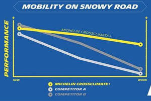 Улучшения модели Michelin CrossClimate+ также затрагивают сцепные характеристики протектора на снежной поверхности. Для этого был разработан инновационный состав резиновой смеси, который помогает обеспечивать уверенное сцепление на сухом и мокром покрытиях дороги, а также мобильность в условиях внезапно выпавших снежных осадков.
