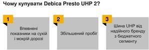Модель Debica Presto UHP 2 была представлена публике к 2017 году как продолжение серии Presto UHP, модели, хорошо оценённой экспертами и потребителями. За разработкой стоят уникальные технологии и богатый опыт корпорации Goodyear, дочерним брендом которой и является польская Debica.