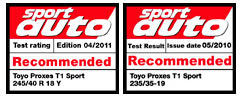 Модель Тойо Проксес Т1 Спорт хорошо оценили журналисты «За рулём» в тестах размера 225/45 R17. Также свою положительную отметку внёс польский журнал “Motor” по итогам тестирований размерности 235/35 R19.