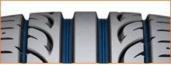 Центральное опорное ребро шины — необходимый элемент жесткости, работает на обеспечение прямолинейной устойчивости. Летние шины Hankook K120 Ventus V12 Evo2 лишены устаревших по дизайну канавок — на их месте теперь размещаются более эффективные для очистки пятна контакта от осадков волнообразные впадины, существенно облегчающие работу основным кольцевым желобам.