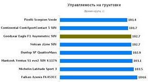 - Хорошими свойствами звукоизоляции протектор шины Гудиер Игл Ф1 Асимметрик СУВ 4x4 обязан грамотно выстроенному рисунку, что также весьма эффективен при торможении и наборе скорости на мокром полотне;
