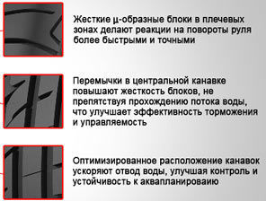 Особенности строения Стабилизаторы маневренности на повышенных скоростях представлены в виде плечевых блоков протектора, которые позволяют водителю ощущать большую уверенность в момент смены курса.