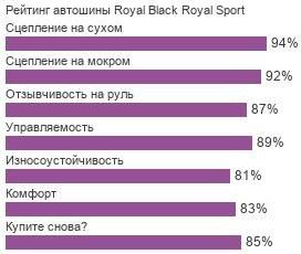 Спортивные черты Название модели Royal Black Royal Sport предполагает развитие хороших спортивных реакций. Разные по схематическому дизайну рёбра покрышки позволяют ощутить полный контроль над скоростным ходом автомобиля, при этом они не способствуют выработке неприятной шумности и сложены так, чтобы при качении автошина не гудела.
