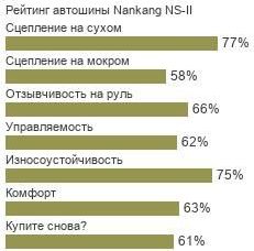 На «родном» асфальтовом покрытии, Nankang NS-II демонстрирует исключительно высокие показатели, снабжает автомобиль хорошей анти-дождевой системой и стабилизирует его торможение. В целом про модель лаконично скажет то, что она: