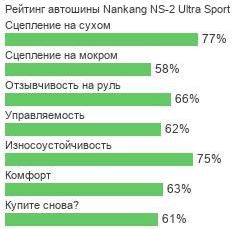 Помимо отлично функционирующего дренажного элемента, протектор покрышек Nankang NS-2 Ultra Sport оснащен тем, что делает скоростную езду в этих шинах удивительно комфортной. Это недорогое и крайне выгодное предложение на грядущий летний сезон! Рейтинги и отзывы Как показывают многочисленные потребительские мнения и отзывы покупателей, представленные шины Нанканг НС-2 Ультра Спорт не имеют ярко выраженных недостатков, что говорит об их удивительной сбалансированности. Это действительно стоящий вариант для тех, кто не решается купить более дорогую брендовую резину со спортивным «огоньком», но в то же время не хочет отказывать себе в спортивности вождения.