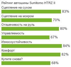 Автомобильные шины Sumitomo HTRZ II Японская авторезина высшей производительности Sumitomo HTRZ II показывает блестящий уровень технологий и качества на дорожных (в основном — асфальтовых) покрытиях. Ряд, в который входит эта модель, насчитывает 3 наименования, объединяет которые исключительная спортивность, отточенность реакций, надёжность независимая от погодно-климатических обстоятельств. Протекторное формирование у шин Сумитомо ХТРЗ 2 демонстрирует настоящую «дождевую» покрышку с выраженной глубокой направленностью каналов, удаляющих лишнюю воду и позволяющих достичь хорошей тяги/маневренности в ненастную погоду.
