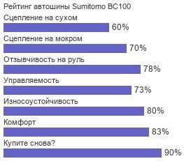 Модель Sumitomo BC100 отличается уверенным сцеплением с мокрой поверхностью и хорошей устойчивостью в отношении аквапланирования, отменной адгезией с сухим асфальтом, а также бережливостью к топливным ресурсам. Последнее качество стало возможным после обновления резиновых составляющих материала шины Sumitomo BC100.
